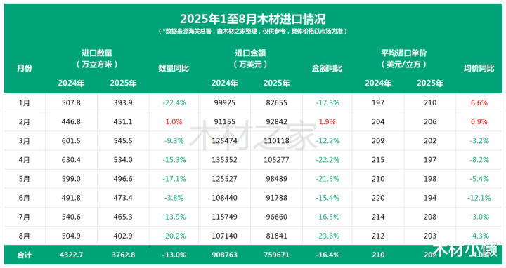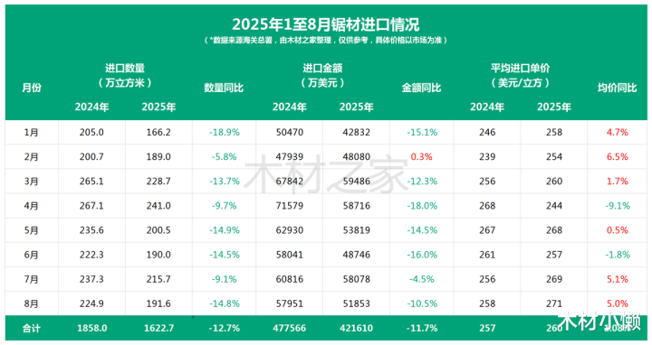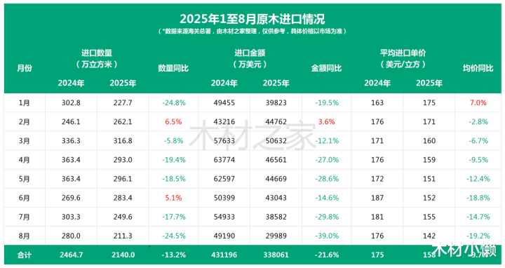 总体上看,2025年前8个月,中国木材进口累计达3462.8万立方米,同比下降13%;进口金额达到75.97亿美元,同比下滑16.4%。其中,前8个月原木进口累计达2140万立方,占进口总量的61.7%,同比下滑13.2%;进口金额下滑21.6%至33.8亿美元。而锯材进口则下滑了12.7%至1916万立方,进口金额下滑11.7%至42.16亿美元。