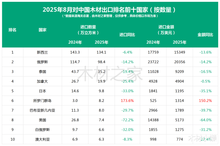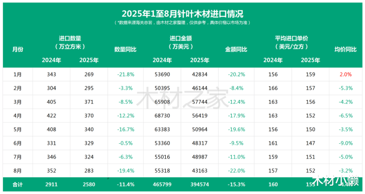 细分材种方面,2025年8月,中国针叶原木及锯材进口283万立方米,占进口总量的70%,同比下滑19.4%;进口金额达到4.31亿美元,同比下降22%。